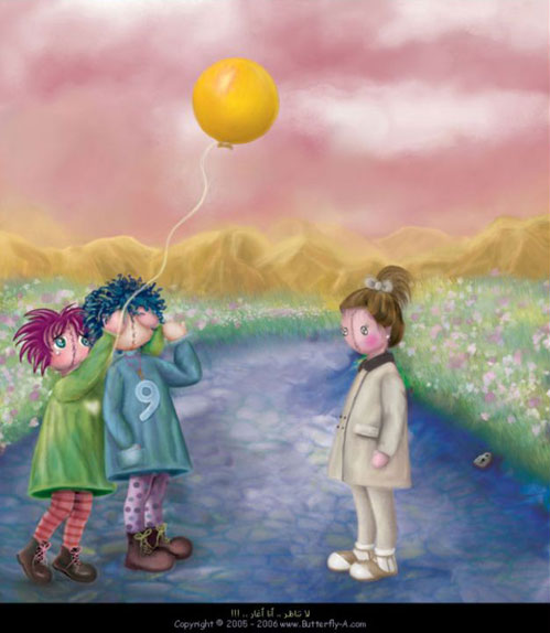 فتاة من بلادي ، تدرس الطب الطب البشري ، تعرفت على موقعها عبر بريد ارسله احد الاصدقاء واحببت ان يتعرف عليها الجميع ، كونها نموذج انساني يستحق ان يتم ابرازه ، كتبت في احد صفحات موقعها ( الاصل في الانسان ان يكون مميزا وفريدا ، فان تواجد في بيئة لا تنمي قدراته نسي اصله وفطرته التي فطر عليها ، وعليه ان يتعب لتحقيق ذاته واكتساب تميزه الذي ضاع ، والتعب حينئذ سيكون رخيصا مقابل ان يستعيد ذاته ويكتسب قيمته التي يستحقها ) احببت رسوماتها مثل انا اغار التي رسمت اعلاه ببرنامج الادوبي فوتو شوب ورسمة لا تجرحوا قلبي واشعر انها لو فكرت بعمل رسومات مصاحبة لقصص الاطفال سوف تنجح وبكل جداره .. بلادنا تنجب الكثير من المميزين بس ندور عليهم كالفراشة .