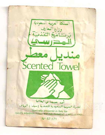 كانت توزع في الفصل قبل الفسحة المدرسيه مجانا من قبل وزارة المعارف آنذاك ولمختلف المراحل الدراسيه ، ولا يسمح لنا بالخروج الا بعد الانتهاء من محتويات الكرتون الذي يعد وجبه الزاميه مكونه من بسكوت وفول سوداني وعلبة حليب ( لم اكن احب الحليب الخاص بهم + يقال انه كانت توزع مع العلبة ذاتها علبة مرقوق – اكله شعبيه – ان كان زمن توزيع الوجبه في اوقات الغداء او العشاء ) وهذه صورة المنديل المعطر الذي كان يوجد داخل الكرتون الذي يوزع على الطلبة واعددته شركة سيف ضمن برنامج التغذيه المدرسيه والذي أستمر منذ عام 1396هـ – 1976م إلى عام 1400هـ 1980 م ، وللمزيد عن المدرسة السعوديه القديمه اضيف هذا الموضوع من جريدة الشرق الأوسط