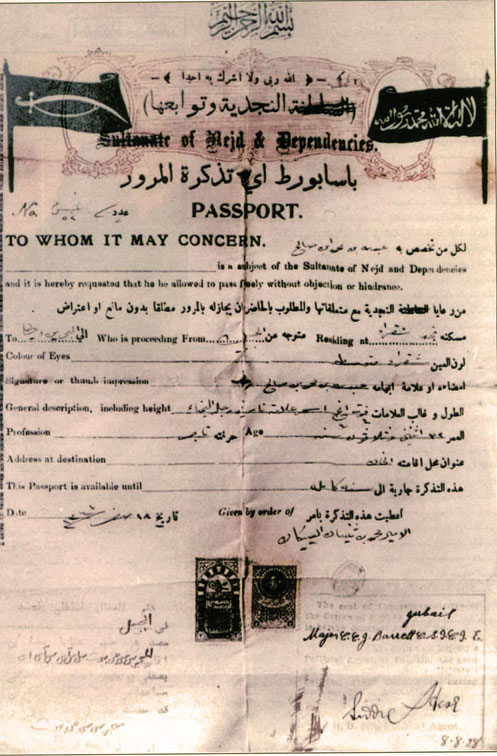 3. .صاحب الجواز أسمه عبدالله بن محمد بن صالح بن سعود بن غانم من القطيف ومسكنه في حي القلعة في فريق أو فريچ أو حارة تسمى الخان. وهو أحد أقاربي وتوجد لدي صورته.