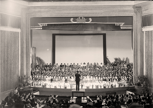 هذه الصورة تعود لعام 1944 ميلاديه ، التصوير بها داخلي و يظهر القاعة الداخلية الملحقة بدار العرض ، الجماهير اتت للاستماع و المشاهده من بلاد مختلفه ومدن عديده ، المايسترو يقود الفرقه ، عازفة البيانو جلست بهدوء في جانب الصوره ، بينما الكورال و الفرقة الموسيقيه توزعوا على المسرح واخذوا اماكنهم كل وفق ما هو مطلوب منه .