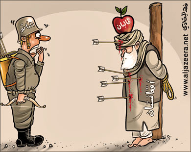 ما يحدث منذ فتره من قتل لابرياء في افغانستان بدم بارد يتشابه مع ما حدث او قد سيحدث في اي منطقة بالشرق الاوسط ، الرسم اعلاه وبه السهام تنام في صدر شيخ اعزل مقيد حافي القدمين ، لم يكن المطلب جسده المتعب لكن التفاحه التي وضعت ولم تكن جزء من عقله او فكره او مرتبطة به  ومع هذا تم ازهاق روحه لاجلها .