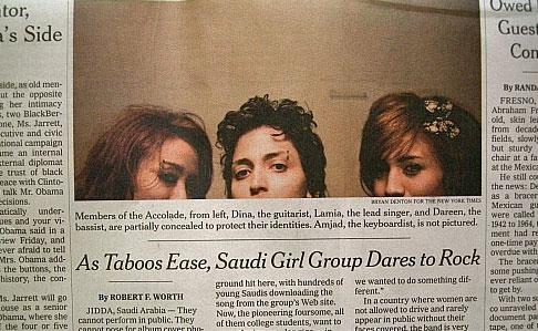 اللقاء الاعلامي مع الفرقة عبر الصحافة الغربيه لم يتعرض للعمل الفني بقدر تعرضه للتي الشيرت الذي يختفي تحت العباءة والبلد التى قدمت الفتيات منه ( للمطالعه اضغط هنا ) وما استوقفني حقا عدم افصاح الفتيات عن هويتهن والسؤال هل هذا محسوب ويعد نوع من الدعايه ، ام انه تردد و قناعة ليست تامه بما يفعلن ؟ حتى الصورة استوقفتني بعض الشئ فقد كانت نصف وجه .