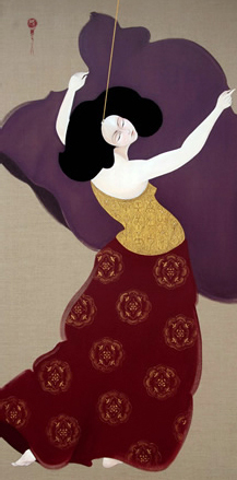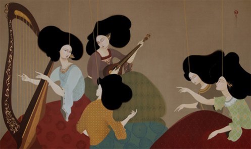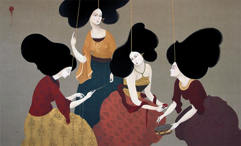 احببت اللوحة اعلاه ، وقد عرضت ضمن المجموعة التي قدمت تحت مسمى (Marionettes ) وهي الدمى التي يتم التحكم بها عبر ايادي خفية او مرئيه ، تحركها بعد ان تقيدها بخيوط رفيعه جاعلة من هذه الدمى المختلفة الادوار والاشكال شئ متشابه بشكل او بآخر .