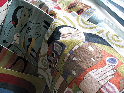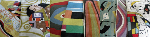كانت معي والدتي حين شاهدتها و لمست اعجابي بها في هذا المعرض فاشترت لي بعضا مما اعجبني ، من ضمن الاسماء الشهيرة التي استخدمت لوحاتها لنسج هذه الاعمال ، بابلو بيكاسو وللاسف لم ابتع من تشكيلته شيئا كون اغلبها تم بيعه ولم يتبقى سوى واحده لم تنل اعجابي ، اما خوان ميرو فقد اشتريت اثنتين مما هو معروض له وهو كثير ، احببت ايضا قطع مميزة لـ غوستاف كيلمت ، بالاضافة الى  قطع اخرى تشبه زخارف فترة الستينات و ربما اوئل السبعينات لكن لم اعرف هي لمن من الفنانين ولاي فترة زمنية بدقة تنتمي   .