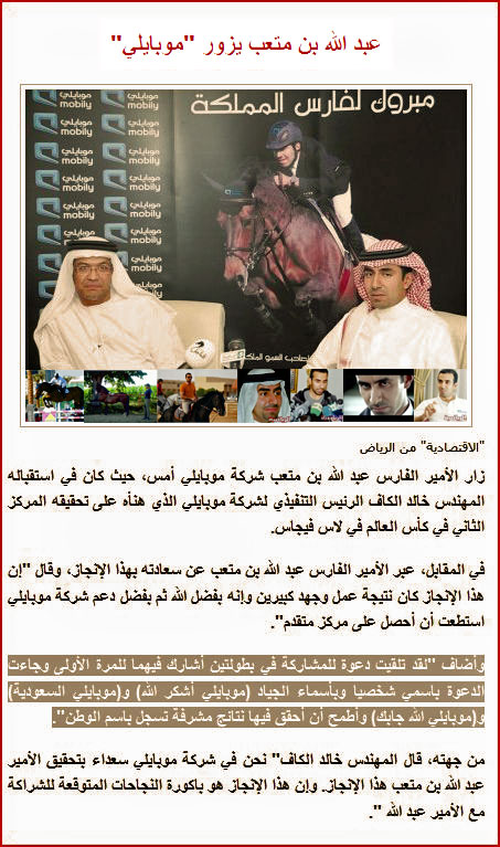 العلاقة القائمة من المؤكد مربحة للطرفين فلا احد هنا يتكرم على الآخر بوقت مستقطع ، وان كان لدي تحفظ في تسمية الخيول باسماء موبايلي ومع هذا ايضا لا اجدها مشكلة كبيره، لمشاهدة الاعلان الذي ظهر به صاحب السمو الملكي عبدالله بن متعب بن عبدالله بن عبدالعزيز هذا العام اضغط زر التشغيل ادناه مع جزيل الشكر لـ كيمو82 .