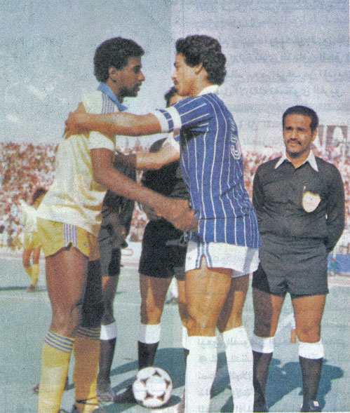 صورة تعود لاوائل الثمانينات وللدقه ما قبل عام 1983 ميلاديه ، يظهر بها نجم ” الهلال ” صالح النعيمه و نجم ” النصر” ماجد عبدالله وكل منهما يصافح الاخر ويقبله بروح رياضية في لقطة خاصة قبل المباراة .