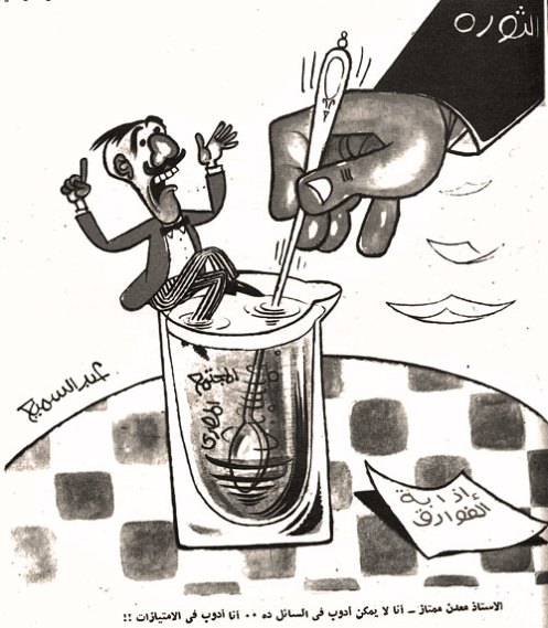 هنا نرى الاستاذ معدن ممتاز يقول وهو يجلس على الحافة رافضا الاندماج ” انا لا يمكن اذوب في السائل ده .. انا ادوب في الامتيازات ! ” .