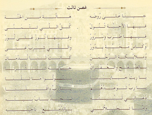 ابياتها تنتمي للشعر الصوفي الشعبي ، تحكي عن احاسيس العبد المتفاوته وعلاقته بالخالق عز وجل  وسعادته حين يدعوه لزيارة بيته بعظيم مغفرته ، بها وصف لمكة المكرمة والحرم الشريف .