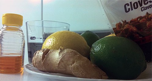 المكونات كانت بسيطه ليمون اصفر ، زنجبيل طازج ، عسل بالقرنفل او عسل عادي وبعض حبات من القرنفل ، كمية من الماء النقي ، وختاما ليمون اخضر ” لايم ” ويسمى – ان لم اكن مخطئ – في مصر لمون ” بنزهير ” والكلمة الاخيره اصلها فارسي وتعنى المضاد للسموم .