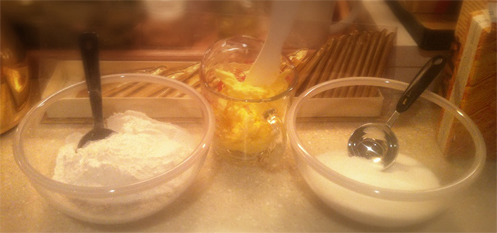 نضيف عصير الليمون وقشره للخليط ثم ملعقة اخرى من الدقيق و نخفقهم معا بالخلاط الكهربائي مرة اخرى .