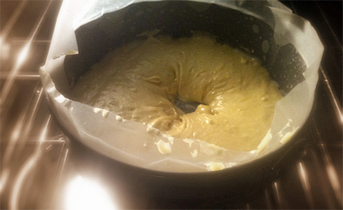 بعد ذلك نسكب الخليط في الصينيه و نحفر فجوة دائريه بالملعقة الكبيرة في المنتصف ، نضعها بعد ذلك بالفرن لمدة ساعة تقريبا ، عند ظهورها ستتلاشى الفجوة و تتماسك لتشبه الكيك العادي .