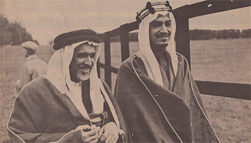 كتب تحت هذه الصورة ” صاحب الجلالة الملك خالد بن عبدالعزيز في لندن عام ٤٣ ينظر الى جواد يسمى ( السيد المتبختر ) و يرى في معية جلالته الشيخ ابراهيم السليمان ” .