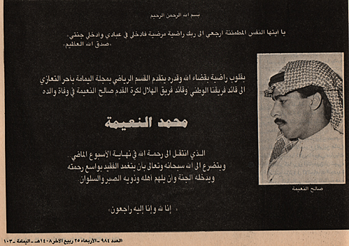 في ذلك المساء سلّمه الأمير فيصل بن فهد كأس البطولة .. و شقّ هتاف الجماهير صدره و اخترق أعماقه .. هو فتى البارحة الذي انضم لفريق الهلال عام ١٩٧٦ ميلادية .. و زين شباب تلك الليلة و أكثرهم سعادة .. فقد حقق النصر لفريقه و لم يخذل الجماهير و لم يفقد الثقة التي أعطيت له .. هو من تم تعينه قائدا للمنتخب السعودي ثم من بعدها قائدا لفريق الهلال .. هو الذي حصل في ذلك اليوم على لقب أفضل لاعب في البطولة بإجماع مدربيّ و إعلاميّ البطولة .. هو من كان الفرح يتدفق في صدره إلا أنه ظل كما عرفته جماهيره .. متزنا و لا يعبر عن شئ سوى بابتسامة تحاول أن تجمح ذلك الانفعال و تخفيه .. فهو منذ بدايته لا يحب أن يبدو بمظهرا لا يليق به أو يفقده توازنه .. و في تلك الليلة .. التي أنجز بها المهمة و كل ما طُلب منه .. و على أكمل وجه و بقدر ما يستطيع .. أغمض عينيه لينام سعيدا ً .. منتشيا باللحظة .. في تلك الليلة أغلق صالح النعيمة جفنيه مثل كل الناس .. دون أن يرى المستقبل .. أو يعلم ما تخفيه الأيام !