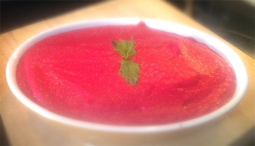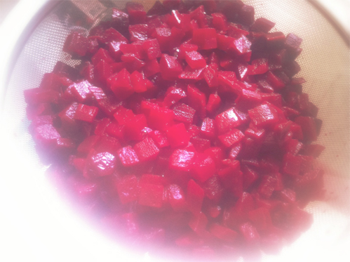 نصفي البنجر من الماء المعلب ثم نضعه في الخلاط الكهربائي و نضيف اليه باقي المقادير ما عدا النعناع .