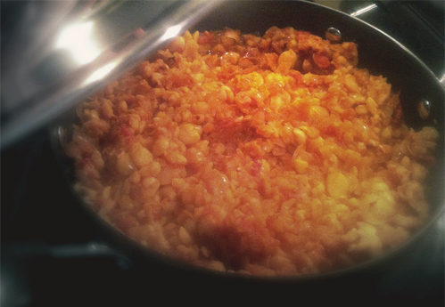 بعد ذلك نحركة مرة اخرى و ان احتاج المزيد من الماء اضفنا لنا و لكن من المهم ان لا يحترق اي جزء من المكونات لضمان نكهة جيده لذا التحريك بين فترة واخرى و الحفاظ على النار بعيدا عن درجة الحرارة القصوى امر مهم .