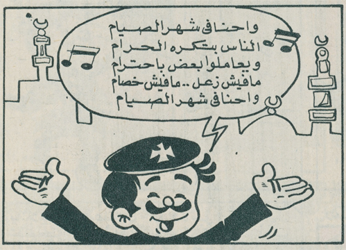 عنوان القصة ” و احنا في شهر الصيام ” سيناريو علاء السعيد و رسوم كمال برشومي و نشرت في العدد ١٢٦٧ في ٢٠ يوليه من ذلك العام ، حيث كان شهر رمضان حاضرا في الصيف كما الآن ، مع اختلافات كثيرة و كبيرة بين ذلك الزمن و وقتنا الحالي سواء في مفهوم الناس لذلك الشهر و سلوكهم خلاله و تفاصيل عديدة و عادات جميلة سقط بعضها سهوا أو عمدا مع اشياء كثيرة لم نهتم بها و ربما نفتقدها بشدة الآن .