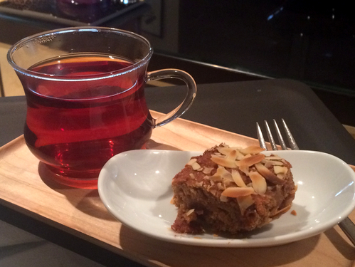كيك التمر اللذيذ و الصحي ، كان طعمه طري و شرائح اللوز المقرمشه فوقه لذيذه ، لم يكن به سكر أو حليب أو بيض أو زيت ، فقط أربع عناصر فحسب ، كوب كبير من القهوة السوداء و كوب ممتلئ من الدقيق ( المضاف اليه الملح و البيكنغ بودر ) ذو التخمير الذاتي ، و ٣٦٥ غرام من التمر و كمية من شرائح اللوز النحيفه .