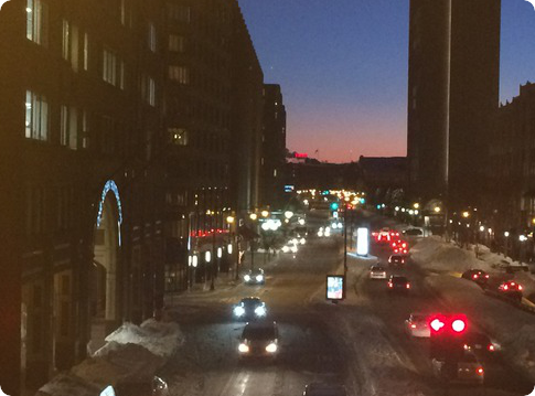 أشرقت الشمس و ذاب بعض الجليد ، رسمت الدروب بالرمادي و اتضحت عتبات الدرج للسائرين ، الشوارع احتضنت السيارات ، و الارض امتدت للمشاة .