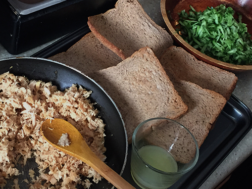 في مقلاة صغيره و على نار شبه مرتفعه نضع قليل من زيت الزيتون ، ثم نضيف اليه التونا المعلبه بعد تصفيتها من الزيت – شخصيا أفضل استخدام ماركة الجيشا – ثم نحرك باستمرار الى ان تتحول كتل التونا الى فتات لا رائحه مزعجه له و تجف القطع من اي سوائل عالقة بها بعد حمسها على النار جيدا.