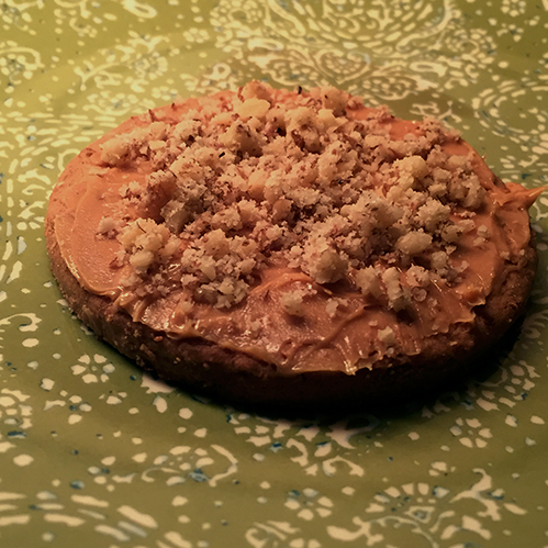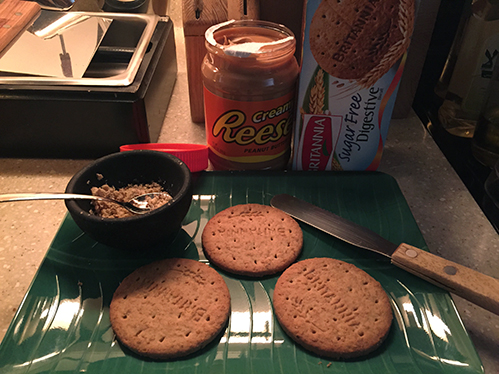 اخرجت ثلاث قطع من البسكوت – الواحدة ٧٣ سعر حراري – دهنتهم بطبقة جيده من زبده الفول السوداني ، و كاني اضيف طبقة ناعمة من كريما التزيين ” فروستنق ” على سطح قطعة كب كيك .