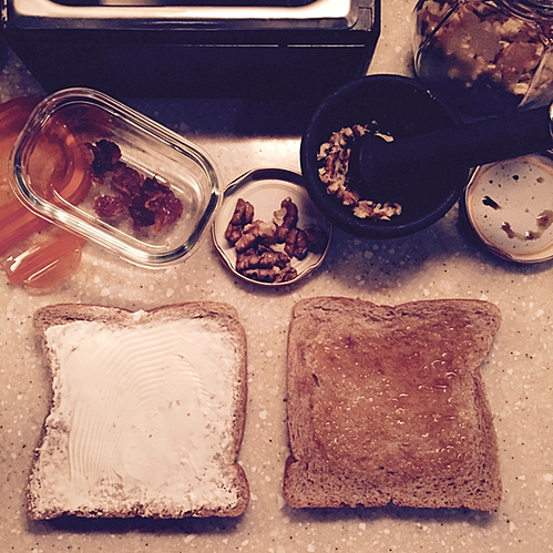 ندهن خبزة توست بالجبن و الأخرى بالعسل ليمسك به الجوز بعد نثره فوقه .
