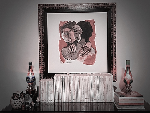 بعد وقت باتت كتبها تنام على رف مستقل لدي ، مُضاف له طبعات قديمة أولى من بعض أصدارتها – قبل أن يكون لها دار نشر – إضافة لكتب أخرى تتحدث عنها و عن أدبها، جعلت من ” طائر البوم ” الذي تحب رفيقا لها بالمكان، مع مصباحين أتو لي كهدية ، لهما تفاصيل شرقية ، و في الأعلى عُلقت لوحة للرسام خوايا ياسمين بعنوان ” العاشقان ” .