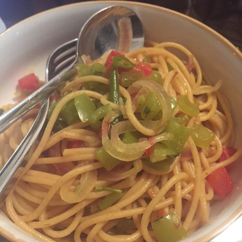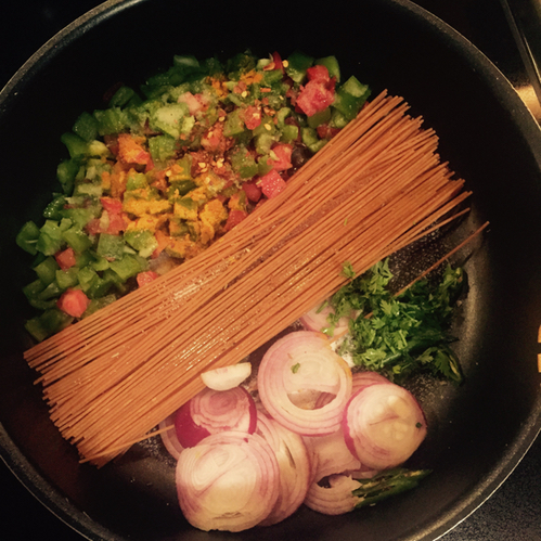 بمقدار غلق قبضة اليد ( كمية متوسطه ) سباجيتي معده من القمح الكامل للمزيد من الألياف الغذائية .