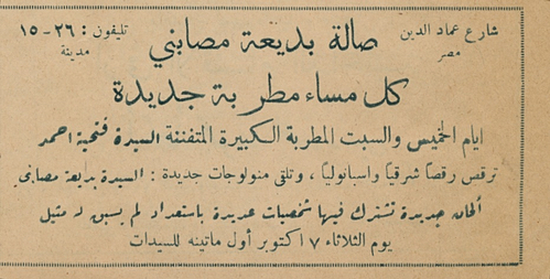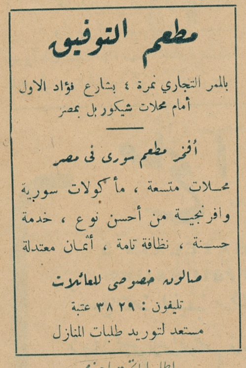 هنا أعلان عن مطعم سوري في القاهرة ، يستقبل الزبائن و يورد الطلبات للمنازل ، استوقفتني عبارة قسم خاص بالعائلات ، و دفعتي لتخيل اجواء تلك الفترة ، تداخل الثقافات ، القدرة على التعايش ، بدايات السينما ، ازدهار فن المسرح و الصالات ، و وجود كافة الاختيارات التي تتناسب مع فئات المجتمع المختلفة ، المحافظ منها و المنفتح ، و ايضا عروض خاصة للسيدات .