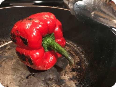 نأتي بحبة واحدة من الفلفل الرومي الاحمر و نقوم بشوائها دونما اي زيت و نقلبها في المقلاة على جميع جهاتها لمدة عشرين دقيقة تقريباً – الى ان يصبح لونها من الخارج داكن بعض الشئ و تحمل نكهة الشواء – نضعها بعد ذلك في كيس بلاستيكي او وعاء غميق و نغطيها و هي ساخنة بورق البلاستيك و نتركها عشرين دقيقه اخرى، بعد ذلك نخرجها و نزيل القشر الخارجي و البذور من الداخل و نقطعها الى شرائح طوليه فحسب .