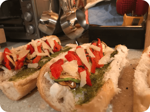 مكونات هذا الساندوتش قابلة للتغيير و التعديل ، فمثلا في الوصفة الاصلية يوجد خبز التشباتا ، اتيت عوضا عنه بخبز فرنسي قصير من مخبز “اليورومارشيه” فجر البارحة، يوجد بروتين حيواني تم استبعاده و هو البورشتو – لحم خنزير مجفف بالطريقة الايطاليه – و لم يستخدم اي لحم عوضا عنه رغبة بالاكتفاء بالخضروات و الجبن فحسب .
