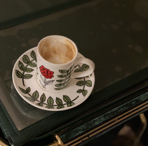 فنجان القهوة الصغير عليه وردة حمراء ليس لها رائحة، لكنها لا تكبر و لا تشيخ و لا تذبل، مع كل عيب يوجد دوما ميزة و العكس صحيح.