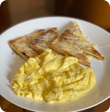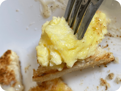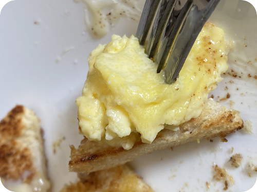 نسكبه في الصحن قرب قطع الخبز، نرش الشرائح المثلثة بالملح جيدا و كمية جيده كوننا لم نملح البيض و نزين سطح الخبز بخيوط من الحليب المكثف حيث ناخذ ملعقة ناعمه صغيرة و نسكب و نحن نحرك يدنا، في البدء قد يتردد البعض لكن حين نتذكر طعم شوكلاته الكراميل الممملحة او المربى الحلوة الطعم مع الزبدة و التوست سنتقبل الفكرة.